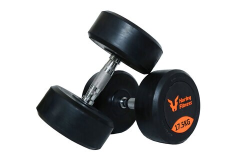 HARLEY FITNESS 17.50KG PREMIUM GENIUNE RUBBER COATED ROUND DUMBBELL PAIR Very well made.