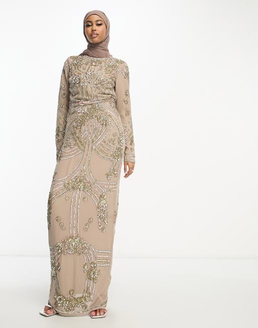 ASOS DESIGN double layer embellished maxi dress with floral embellishment in taupe Very well made.