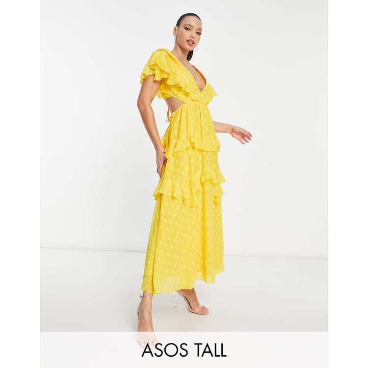 ASOS DESIGN angel sleeve plunge dobby tiered maxi dress with cut out and rouleux detail in mustard Very well made.