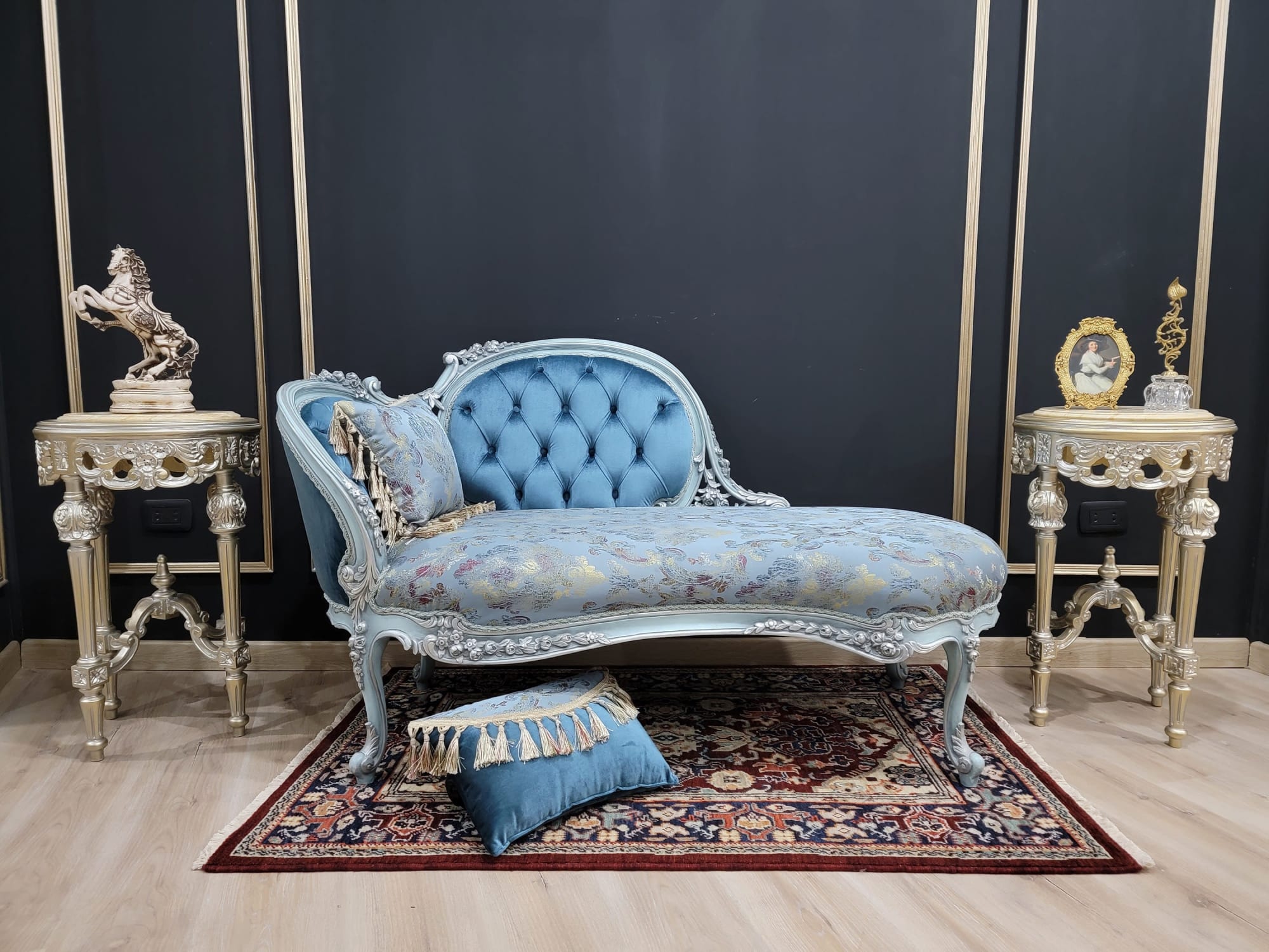 French Style Chaise Lounge Aged Silver Blue Frame Finish by Art Very well made.
