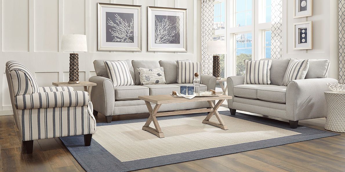 Beachfront 7 Pc Silver Gray Polypropylene Fabric Living Room Set With Sofa Loveseat 3 Pc Table Set Table Lamp Very well made.