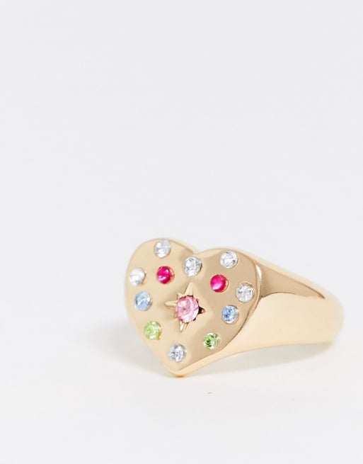 ASOS DESIGN chunky heart ring with multicoloured stones in gold tone Very well made.