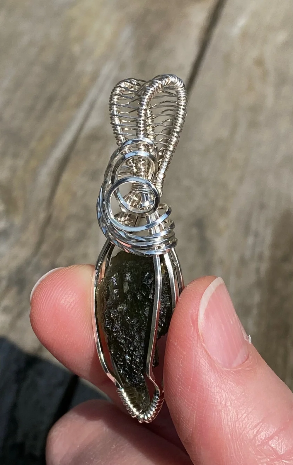 Moldavite Wire Wrapped Pendant Sterling Silver Wire OLD EARTH Very well made.