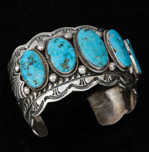 Wide intricately stamped Navajo row cuff with five Kingman turquoise stones by Marcella James. 1461 Very well made.