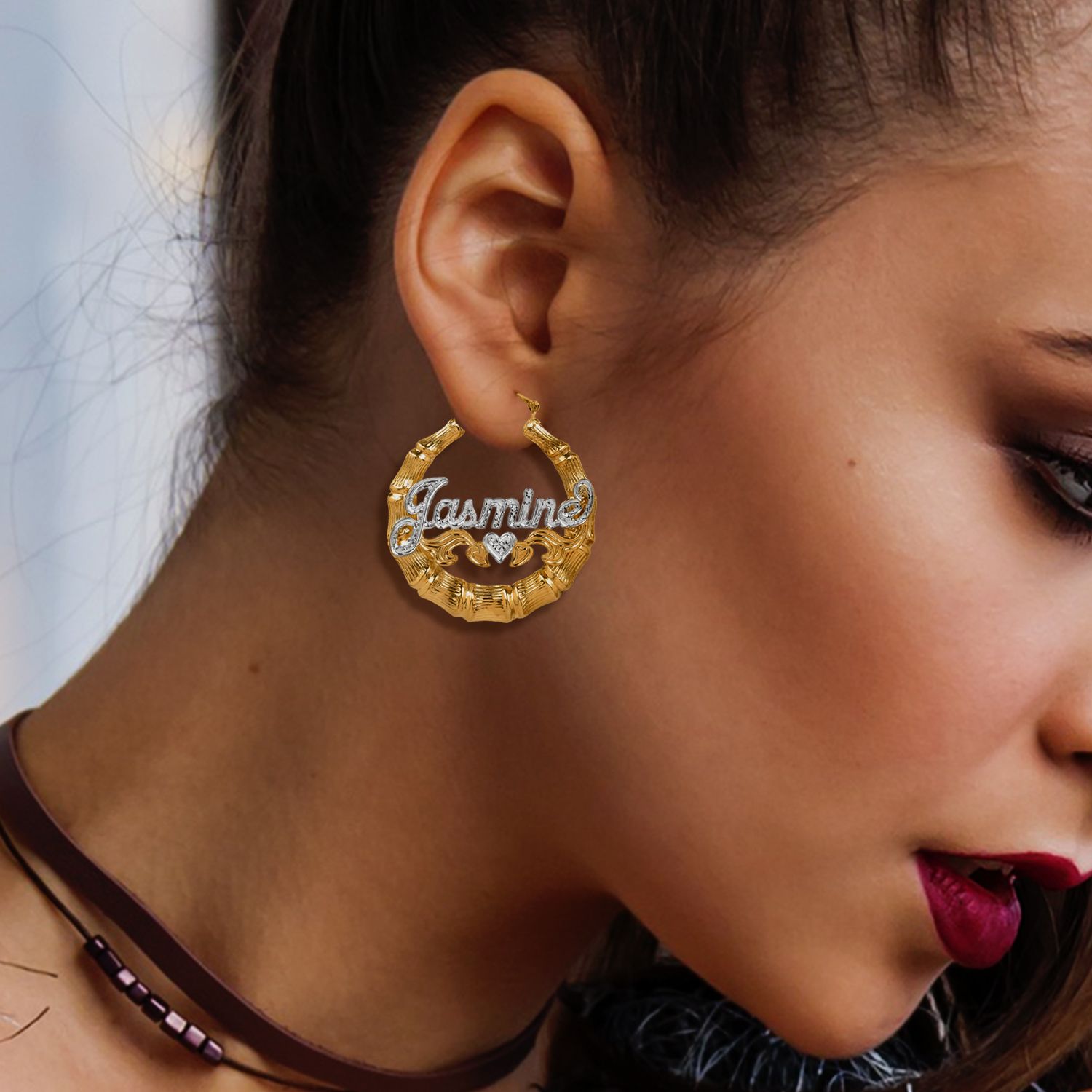 10k or 14k Genuine Gold Personalized Shiny Name Heart Shape Bamboo Earrings 2.4 Inches Wide Diamond Cut Hearts Very well made.