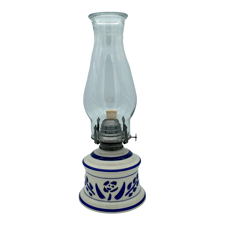 Vintage 1970s Lamplight Farms U.S.A. White Blue Chimney Oil Lamp Very well made.